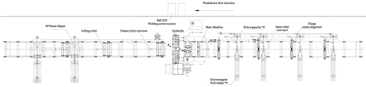 As linhas padrão de soldagem de feixe ZHJ3-in 1 H consistem em uma tabela de rolos de entrada, estação de soldagem e alisamento principal, tabela de outputroller. Na principal estação de soldagem e endireitamento, instalou-se unidades de recuperação de fluxo, cabeça de soldagem com dispositivos de tocha e estação de flange e web.